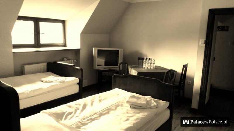 Dojście do zamku prowadziło po zboczu wzgórza w kierunku bramy umieszczonej we wschodnim boku murów obwodowych. Naprzeciwko wjazdu stał dom mieszkalny, zamykający dziedziniec od strony zachodniej. W części północnej mieściła się kaplica a w południowej, w przyziemiu refektarz o trzyprzęsłowym sklepieniu żebrowym wspartym na dwóch filarach. Zapewne pierwotna wysokość budynku sięgała 13 m, wskazuje na to poziom ganku łączącego wieżę z chodnikami straży. W narożniku południowo-wschodnim, na lewo od wejścia, została wzniesiona wieża, mająca około 20 m wysokości, zbudowana na planie kwadratu, od wysokości 17 m - cylindryczna. W dolnej kondygnacji mieściło się więzienie, wyżej siedziba straży ze strzelnicami, w części cylindrycznej pomieszczenie z dwoma strzelnicami i wykuszem. Najwyższa kondygnacja zwieńczona blankami stanowiła pomost dla straży. Wieża wysunięta poza linię muru od strony wschodniej stanowiła skuteczną obronę wejścia, pełniła więc potrójną funkcję: była strażnicą, więzieniem i elementem obrony dostępu do bramy.